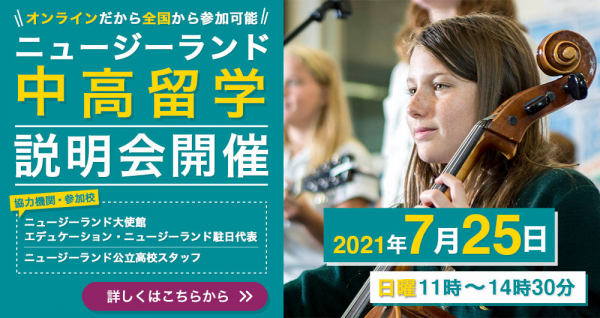 株式会社ワールドアベニュー (本社:東京都千代田区)では2021年7月25日(日曜日)11時よりニュージーランド大使館 エデュケーション・ニュージーランド駐日代表、そして9校の現地公立学校スタッフをゲストに迎え、中学・高校留学説明会 2021年第2弾をオンラインにて開催いたします。