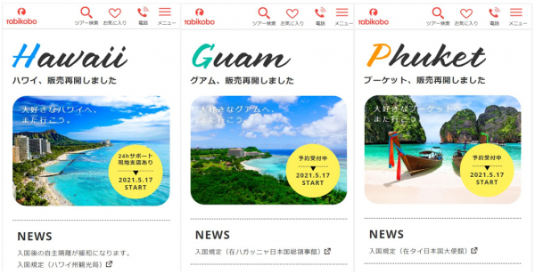 今年だけでなく、来年2022年5月までのツアーを掲載しています。ハワイは既に観光客の受け入れを開始していますが、まだ観光客の受け入れが発表されていないグアム、プーケットに関しても1年先までのツアーを掲載しているため、1年後にどこ行こう?と先の計画を立てる際にご利用いただけます。