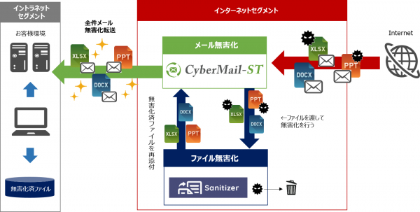 今回、『Sanitizer』の連携により、『CyberMail-ST』に受信したメールの添付ファイル内のコンテンツ全てを自動的に無害化処理の上、メールに再添付及び基幹系ネットワーク環境に送信することができます。セキュリティとユーザーの利便性のバランスを保ったインターネット分離を実現し、メール経由の脅威やリスクの排除ができ、企業の情報保全の強化及びメール関連業務の負担を軽減への貢献を目指しています。