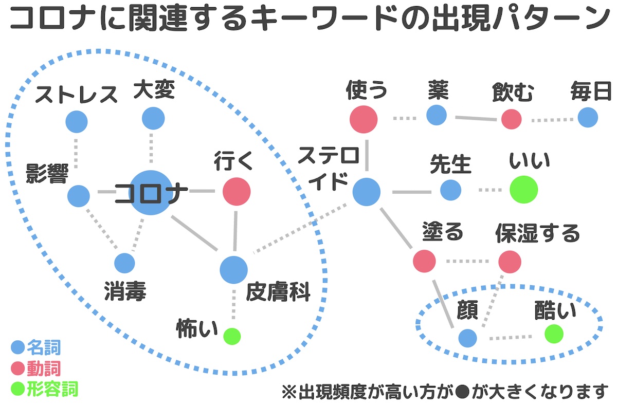 外出自粛については、「コロナで皮膚科行けなくなっていたら酷くなってしまい、病院に行ってきました」とユーザーが新型コロナ感染を恐れて、通院を控えた結果、症状が変化していることが伺えます。