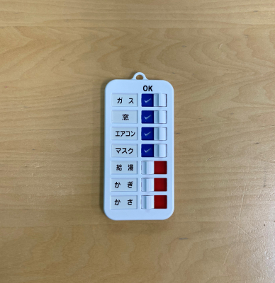 「あんしんチェッカー」は、火の元や戸締り、持ち物忘れなど、出かける前のチェック項目を「見える化」することで、外出後の不安を解消する便利グッズです。本体には、「ガス」や「エアコン」などの項目はじめ、お子様向け、介護用、あるいはご自身の必要事項が書き込めるお助けシールが付いているので、汎用性があります。本体のスライダーをすべて赤にしてからチェックをし、確認が済んだら、スライダーを右に動かして完了(項目が(チェックボックス チェック)マークに変ります)。本体の裏面は磁石付きなので、冷蔵庫などに張り付けることが出来ます。磁石が使えない場所は付属の両面テープやフック穴を活用して使用します。