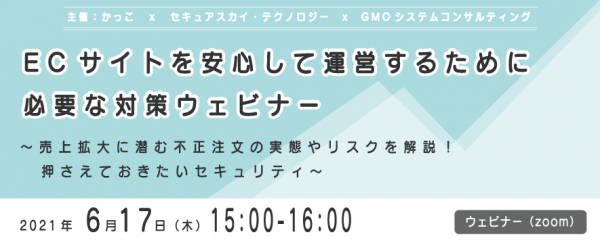 株式会社セキュアスカイ・テクノロジー(本社:東京都千代田区 代表取締役:大木 元 以下、SST)、かっこ株式会社(本社:東京都港区 代表取締役社長CEO : 岩井 裕之 証券コード:4166 以下、かっこ)およびGMOシステムコンサルティング株式会社(本社:東京都渋谷区 代表取締役社長:寺島 俊樹 以下、GMOシステムコンサルティング)は、ECサイトを運営する企業向けに「ECサイトを安心して運営するために必要なセキュリティ対策とリスク」をテーマにしたウェビナーを6月17日(木)に開催します。