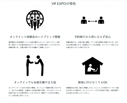 VR EXPOは、2017年から年2回、東京と大阪で開催している展示会です。2019年12月の第5回には38社が出展し、750名が来場しました。2020年はコロナ禍の影響で体験展示ができませんでしたが、2021年8月に2年ぶりの現地開催となります。