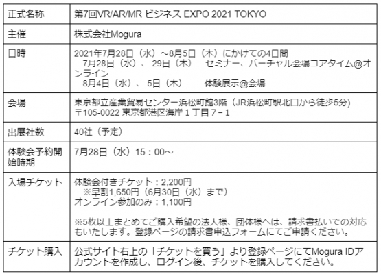 株式会社Mogura(本社:東京都千代田区、代表取締役社長:久保田 瞬)は、2021年7月28日から開催する「VR/AR/MR ビジネス EXPO 2021 TOKYO」(VR EXPO 2021 TOKYO)の入場券を本日6月4日(金)から公式サイトにて販売開始致しました。