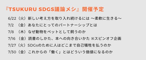 「TSUKURU SDGs議論メシ」を通じて、参加する方それぞれにとっての「SDGs(持続可能な開発目標)」が具体的に見えてくることをとても楽しみにしています。