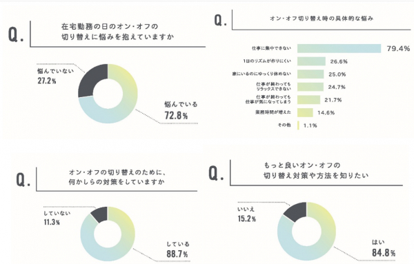 在宅勤務の日にオン・オフの切り替えに悩みを抱えていると回答した方は全体の約70%、オン・オフの切り替え時の具体的な悩みとしては、約80%が仕事に集中できないという回答に。在宅勤務の日のオン・オフの切り替えに悩みを抱えていると回答した人のうち、オン・オフの切り替えのために、何かしら対策をしていると回答した方は約88%である一方、良いオン・オフの切り替え対策や方法を知りたいと回答した方が約85%。