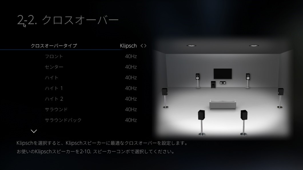 このモードは、前述の自動音場補正技術と組み合わせることも可能です。すでに自動音場補正を行いクロスオーバー周波数を設定しているお客様も、そうでないお客様もソフトウェアアップデート後に追加される設定メニューから組み合わせるReferenceシリーズの型番を指定するだけで、クロスオーバー周波数は推定値ではなく理想値となり、スピーカーシステムの低域再生能力を最大化することができKlipschのスピーカーの設計思想と合わせた再生が可能になります。