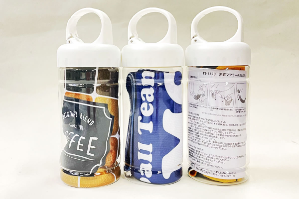 涼感マフラータオルがボトルに入っている姿は目に留まりやすく、印象付けに最適です。全面にロゴを入れた、会社やサービスのノベルティとして、また販売品としていかがでしょうか。