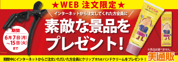 プロ向け美容材料の通信販売サイト「美通販」(https://www.bitsuhan.com/site)が、インターネットからご注文してくれた方全員に素敵な景品をプレゼントする「WEB限定全員プレゼントキャンペーン」を開催。プレゼントは、サロンワークで使える「クリップ」または「ハンドクリーム」をご用意いたしました。景品はご注文商品に同梱してお送りいたします。キャンペーン期間は、2021年6月7日(月)から6月15日(火)まで。