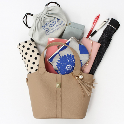 長財布、ミニポーチ、スマートフォン、折り畳み傘、水筒、お弁当箱がしっかりと入ります。