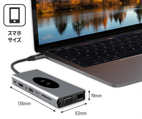 ワイヤレス充電ポートを含めて合計15個のポートがまとまっているにもかかわらず、「HUNDA 15 in 1 USB-C ハブ」の大きさは小柄なスマホとほとんど変わらない136×63×19mmという大きさや厚さ。