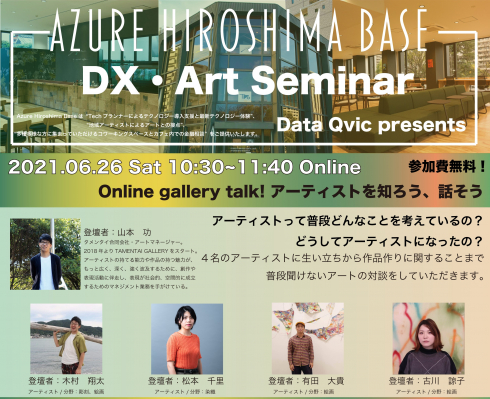 アートマネジメント事業を手掛けるタメンタイ合同会社(広島市)所属アーティストの有田大貴、木村翔太と代表の山本功は、山口フィナンシャルグループの株式会社データ・キュービック(本店:山口県下関市)が主催し、2021年6月26日(土)に開催されるトークイベント「Online gallery talk! アーティストを知ろう、話そう」に登壇します。広島を拠点に全国各地の展覧会で活躍する若手美術作家の生の声を、一同に聞くことができる貴重な機会です。
