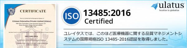 研究支援エナゴ(英文校正:https://www.enago.jp/ )やボックスタブ(文字起こし:https://www.voxtab.jp/ )を運営するクリムゾンインタラクティブの翻訳部門であるユレイタス( https://www.ulatus.jp/ )では、これまでにも世界の医療機関やヘルスケア企業に数多くの言語ソリューションを提供してきました。医療業界の品質基準を満たすこれまでの企業努力に基づき、当社はサプライヤーの品質管理システム(QMS)の評価プロセスも伴うISO 13485認証を取得しました。