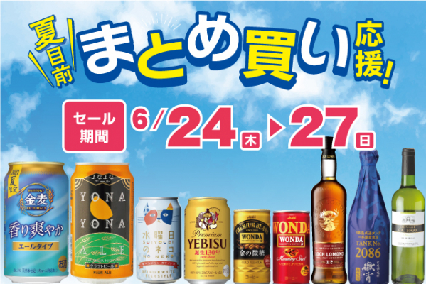 全国に183店舗で酒の専門店をチェーン展開する株式会社リカーマウンテン(本社:京都市)は、6月24日(木)~27日(日)の4日間、深夜営業店舗を除く119店舗で「夏目前 まとめ買い応援!セール」を開催いたします。