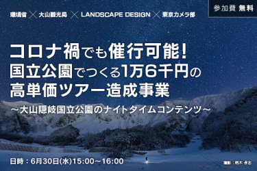 写真とSNSを活用した地域創生支援を行う東京カメラ部株式会社(東京都渋谷区、代表取締役社長:塚崎秀雄)は、「コロナ禍でも催行可能!国立公園でつくる1万6千円の高単価ツアー造成事業~大山隠岐国立公園のナイトタイムコンテンツ~」と題した無料オンラインセミナーを2021年6月30日に開催いたします。