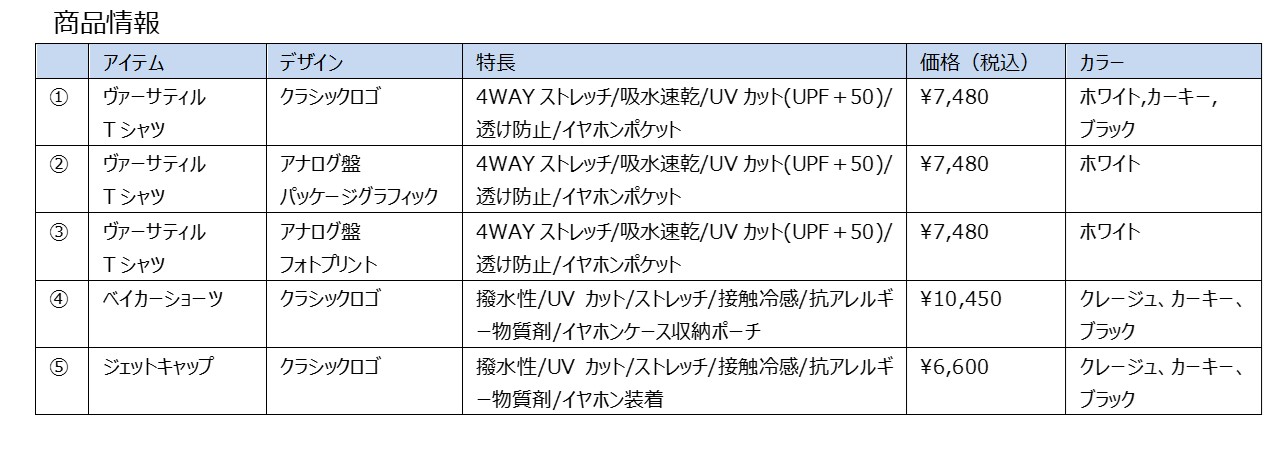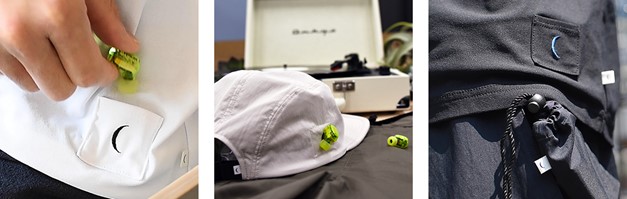 完全ワイヤレスイヤホンが収納できるマグネット付きイヤホンポケットの付いたTシャツ、イヤホン一時的に留めおけるイヤホン用装着マグネット付きジェットキャップ、イヤホンケースが収納できるポーチを付属したデザインショーツの3アイテムが展開。