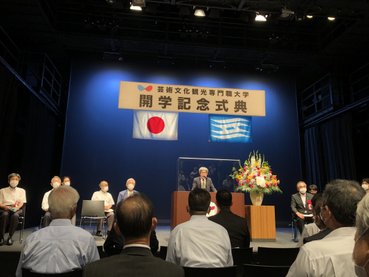 開学記念式典は、当大学、平田オリザ学長、副学長、教職員他、来賓には兵庫県知事、兵庫県議会議長、兵庫県議会議員、兵庫県関係衆参国会議員、文部科学省、公立大学法人理事長、副理事長、地元商工会等関係団体など多くの方々が出席され、新型コロナ感染対策が徹底される中、盛大に開催されました。