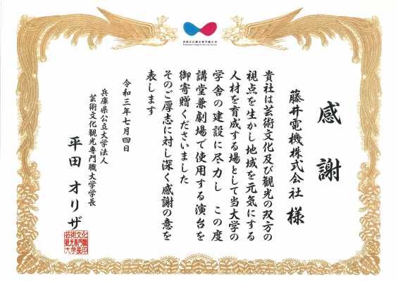 藤井電機は、令和3年7月4日14 時から行われた、豊岡市の兵庫県公立大学法人 芸術文化観光専門職大学 開学記念式典において感謝状を授与されました。