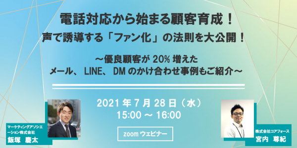 コールセンター代行サービスを提供しているマーケティングアソシエーション株式会社(本社:東京都台東区 代表取締役:相内あゆ美、以下マーケティングアソシエーション)は、株式会社コアフォース(本社:東京都港区 代表取締役社長:野口学夫、以下コアフォース)と、2021年7月28日(水)に無料Webセミナー「電話対応から始まる顧客育成!声で誘導する「ファン化」の法則を大公開!~優良顧客が20%増えたメール、LINE、DMのかけ合わせ事例もご紹介~」を共催いたします。