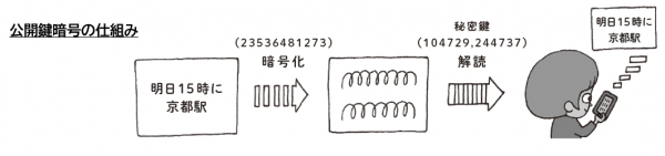 公開鍵暗号とは、暗号化するカギと復号するカギが異なる暗号のことです。暗号化するカギを公開鍵、