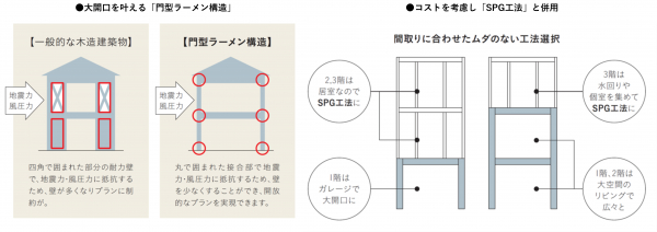 強固な接合部によって建物を支える構造。そのため、一般的な在来工法よりも壁を少なくすることができ、大開口の空間をつくりやすくなります。一方で、門型ラーメン構造に使用する部材は、コストアップに繋がる場合もあるため、居室など小さな空間部分にはオリジナルの「SPG(ストロング・ポスト・グリッド)工法」を採用し、場所に合わせて最適な構造とすることで開放的な空間とコストへの考慮の両方を実現しています。