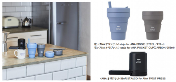 「ストージョ」は折り畳んで持ち運べて繰り返し使えるコーヒーカップ、「ツイストプレス」は電気を使わず手動でツイスト構造の圧力を利用して抽出するコーヒーメーカーで、共にANAオリジナルデザインロゴ入りにて7月20日より発売します。