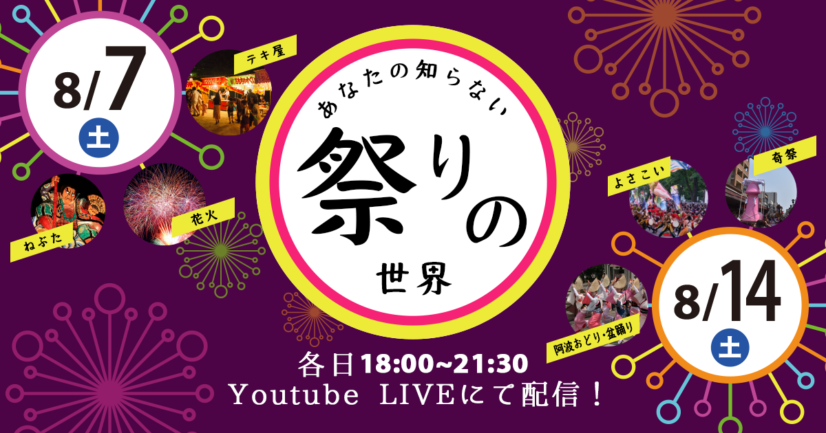 全国の祭りをサポートする専門会社 株式会社オマツリジャパン(代表取締役社長:加藤 優子、所在地:東京都渋谷区、以下オマツリジャパン)は、新型コロナウイルス感染症拡大の影響により、日本全国の祭りが2年連続で中止を余儀なくされる中、祭りの雰囲気を自宅で楽しむ機会を提供したいとの想いから、テキ屋や花火などの各種テーマ毎に、祭り団体・関係者に登壇いただくオンラインイベント『あなたの知らない祭りの世界』を2021年8月7日(土)、8月14日(土)の2日間に渡り開催いたします。