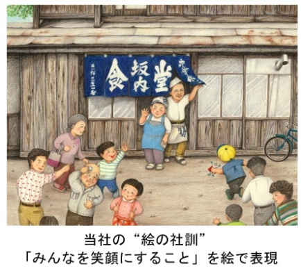 当社が同団体を選出した理由のひとつに、当社の経営理念である「食を通じた、気持ちの温もり」や、当社の全店舗内に掲げている“絵の社訓”と、同団体が掲げている4つの活動理念の中のひとつである“地域まるごと家族”に通じるものを感じたからです。当社は、新卒や中途、国籍を問わず、絵に描かれている気持ちの部分を共有しやすいことから、“絵の社訓”を導入しています。この“絵の社訓”には、出迎えるオーナー夫婦の笑顔と、店に訪れるあらゆる年代のお客様の笑顔が描かれており、「ちょっこおいでま 子ども食堂キャンバス」が伝えたい想いとの一致を感じました。