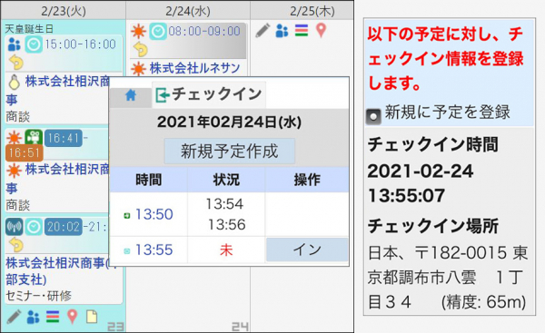ユーザからの要望が多かった「チェックイン機能」は、業務開始時刻と終了時刻にスマホから緯度経度を取得してチェックイン・アウトを登録する機能です。チェックイン状態を全ユーザが確認することができるため、顧客訪問を主たる業務とする企業だけではなく、リモートワークでの勤務状況の確認にも活用できると考えております。
