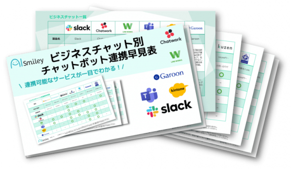 ビジネスチャット別AIチャットボット連携早見表をお求めの企業担当者様は、以下お問い合わせフォームに必要事項記入の上、お問い合わせ内容欄に「チャットボット連携早見表」と記載し送信ください。