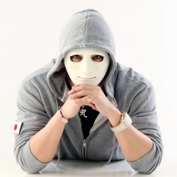 白い仮面とグレーのスェットが
