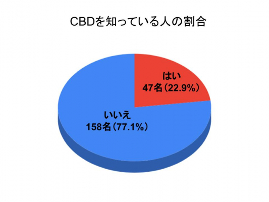 CBDを知っている人は22.9%(47人)・知らない人は77.1%(158人)という結果にとどまりました。