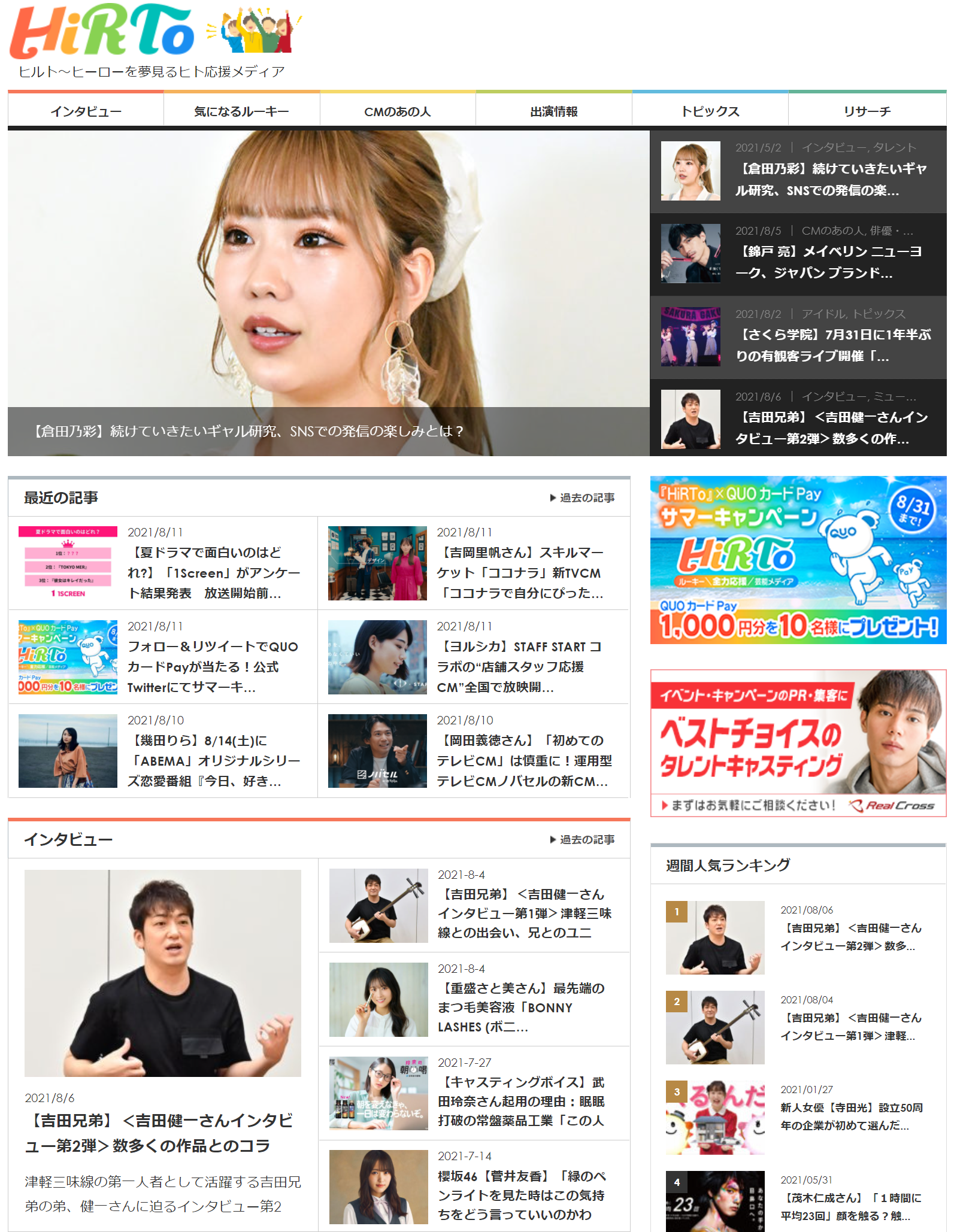 HiRTo(ヒルト)は、『ヒーローを夢見るヒト応援メディア』をコンセプトに、株式会社リアルクロスが2021年1月から提供する芸能ニュース・インタビューサイトです。