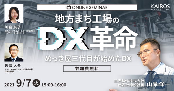 マーケティングオートメーション「Kairos3(カイロススリー)」を提供するカイロスマーケティング株式会社(本社:東京都渋谷区、代表取締役:佐宗 大介、以下「カイロスマーケティング」)は、オンラインセミナー「地方まち工場のDX革命 -めっき屋三代目が始めたDX-」を2021年9月7日(火)に開催することをお知らせいたします。