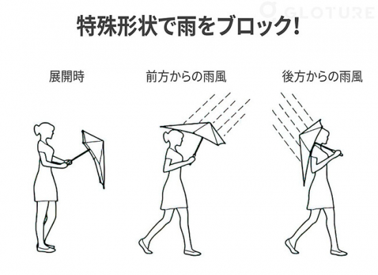 また、傘の後部が大きい特殊デザインにより、背中側が濡れにくく快適です。