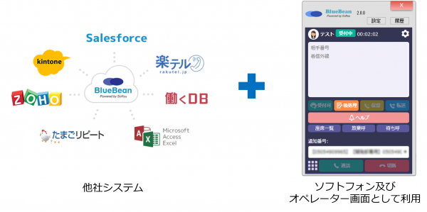 BlueBeanClientは、パソコン上でご利用いただける無償提供の電話機(ソフトフォン)です。他社システムとの連携設定が可能なので、現在ご利用いただいている顧客管理システムを変更せずに、コールセンターシステムをご利用いただけます。