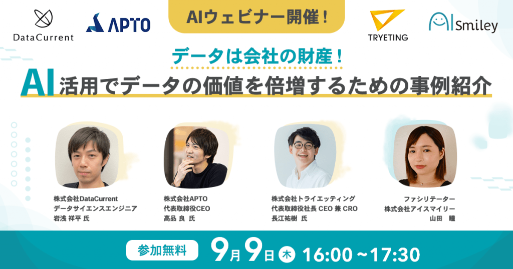 人工知能を搭載したサービスの資料請求ができるAIポータルメディア「AIsmiley」を運営するアイスマイリー(東京都渋谷区、代表取締役:板羽晃司)は、9月9日(木)16時から、データは会社の財産!AI活用でデータの価値を倍増するための事例紹介をテーマにウェビナーを開催いたします。