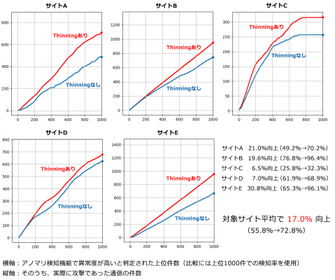 導入前の検証として、Scutum導入サイトから5サイトを無作為に選択し、各サイトの直近800万件の通信についてThinning手法「あり」「なし」それぞれで抽出した異常度の高い1000件のうち最終的に攻撃と判定された通信の割合を比較した結果、下図の通りThinning手法「あり」では「なし」と比べて、アノマリ検知機能単体での攻撃検出率が平均で55.8%から72.8%へと、約17%の大幅向上を示しました。