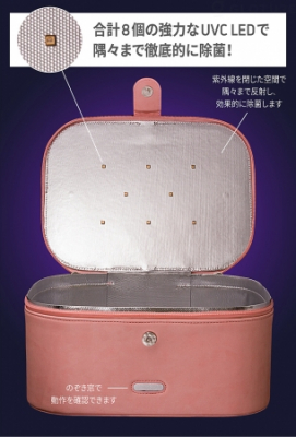 合計8個の大量のUVC LEDから放出された紫外線(UVC)をバッグ内で乱反射させて隅々まで除菌。