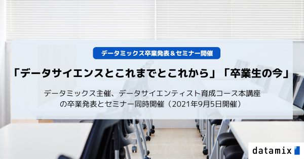 株式会社データミックス(本社:東京都千代田区、代表取締役:堅田洋資、以下、データミックス)は、9月5日に開催される「2021年2月期データサイエンティスト育成コース本講座(以下、データサイエンティスト育成コース)」の卒業発表会にて、弊社代表・堅田とデータサイエンティスト育成コースの既卒生による講演会を実施します。