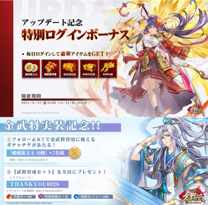 LR武将登場に合わせ、特別ログインボーナス、Twitter限定の特典アイテムプレゼント、14日間初心者イベントの調整も同時に実施いたします。