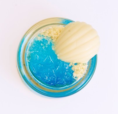 甘くて爽やかな “ブルーライチシロップ” を使った青色と水色のジュレは、濃さの違いによって