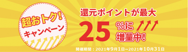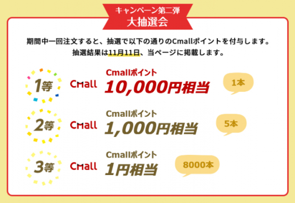 セール開催中に、Cmall独自の口座から支払うと、最大で決済金額の25%を還元します。さらに、9月30日までにご注文いただいたお客様から抽選で、最大10,000円相当のポイントを後日進呈いたします。