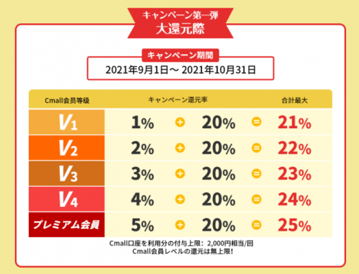 通常の会員ポイント還元のところ、Cmall独自の口座から支払うと更に決済金額の20%をボーナスポイントとして付与します。ポイント還元が最大25%までアップします。