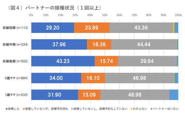 さらにパートナーの接種状況を聞いた。すでに1回以上ワクチンを「接種した」のは、妊娠初期29.20%、妊娠中期37.96%、妊娠後期43.23%、0歳児34.00%、1歳児31.90%となった(図4)。