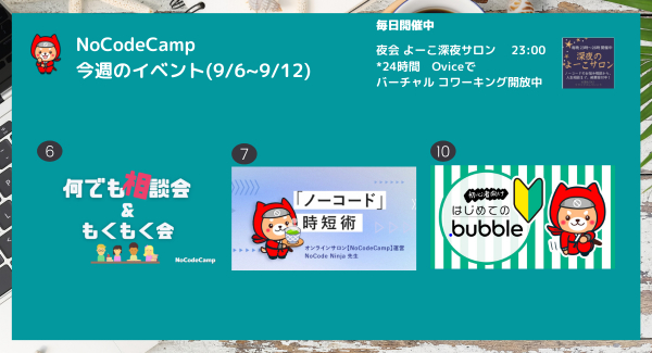 NoCodeCampが主催する7日連続イベントを、9月6日からの週も実施します。NoCodeCampのサロン会員が参加することが可能です。