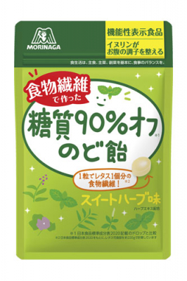 砂糖や水あめを水溶性食物繊維に置き換えた 糖質 90 %オフの「のど飴」 です。