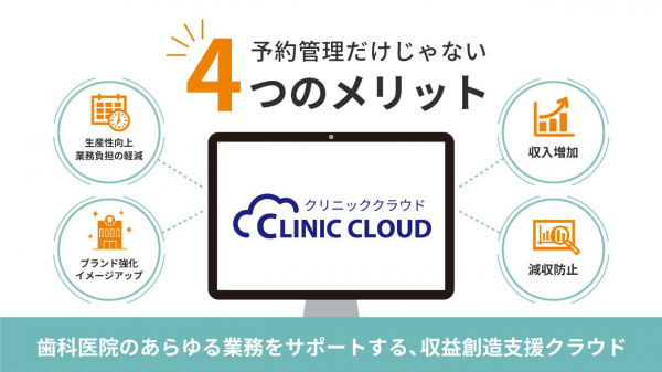 当社が提供する『クリニッククラウド』は、スタッフの人手に頼っていた歯科医院のあらゆる煩雑な業務をシステム化し、医院経営課題を総合的に解決するサービスです。予約管理はもちろん、収入増加(新規患者獲得、リコール成功率向上、自由診療比率向上)、減収防止(離脱防止、無断キャンセル防止、来院未定患者減少)、ブランド強化(感染対策などクリニックの取り組みを情報発信)、生産性向上(電話応対軽減、キャンセルフォロー軽減、リコール準備軽減)など多数のメリットが認められ、全国多数の歯科医院に導入されています。