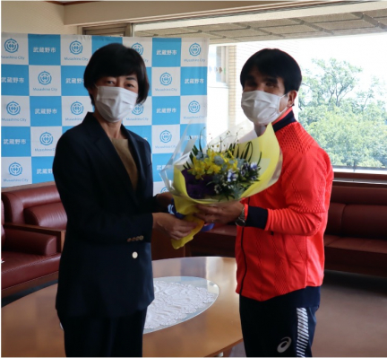 武蔵野市在勤である東京2020パラリンピック5人制サッカー(ブラインドサッカー)日本代表・田中章仁(あきひと)選手は、本日令和3年9月10日(金)に大会の報告をするため、松下市長を表敬訪問されました。
