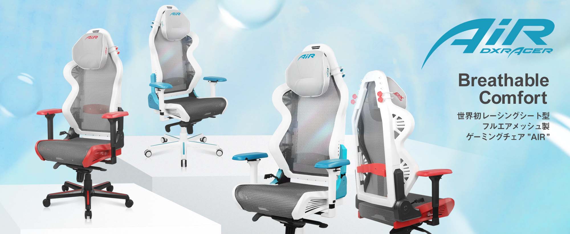 レーシングシートの製造により受け継がれたチェア製造技術をベースに、eSportsプレーヤー向けに初めてゲーミングチェアを製品化したゲーミングチェアパイオニアブランドである“DXRacer”が、曲面の多いレーシングシートタイプの3次元立体成型メタルフレームで構成されるゲーミングチェアの座面、背もたれに初めてエアメッシュを採用。従来の当社製品の特徴である、最大150°のリクライニング機能、ハイスペックなパーツによる高い機能性を踏襲しつつ、最大限の通気性にこだわり開発された、世界初レーシングシート型フルエアメッシュ製ゲーミングチェアが “AIR”シリーズです。